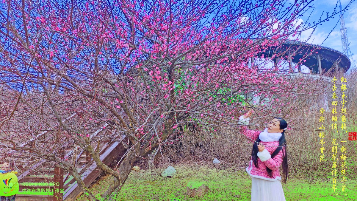 紅樓玉宇翅角檐,一樹梅花倚亭前。 冬去春回枝頭俏,花開花落伴百年。