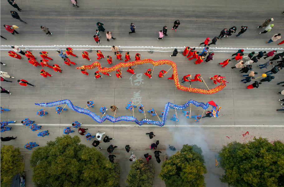 壽縣是楚文化的故鄉,民間藝術璀璨。每年的農歷二月二,壽縣保義鎮都會舉辦舞龍、劃旱船、大頭娃娃、走高蹺等民俗表演活動,街頭巷尾鑼鼓喧天,彩龍勁舞,鞭炮齊鳴,祈福新年風調雨順、五谷豐登。 因疫情歷經三年按下“暫停鍵”,今天保義鎮五大戶,五色彩龍終于又舞動起來。常家白龍象征圣潔,張家青龍象征希望,夏家紫龍充滿吉祥,黃家黃龍喻意富貴,洪家紅色代表火紅。