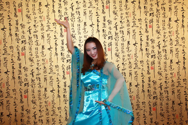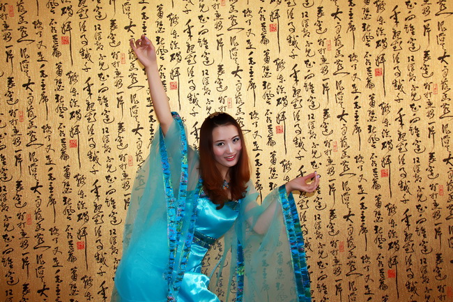 書法壁紙前的美女