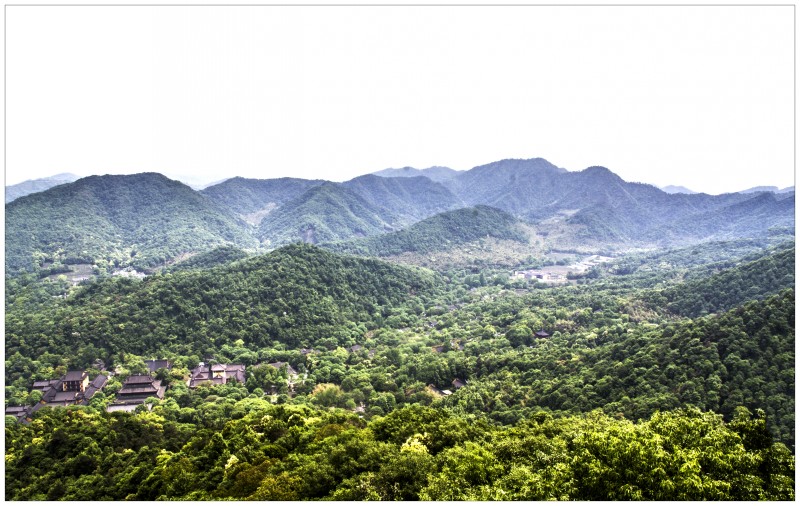 此地群山屏繞,湖水鏡涵,由上視下,歌舫漁舟,若鷗鳧出沒煙波,遠而益微,僅規(guī)其影。西望羅剎江,若匹練新濯,遙接海色,茫茫無際。張公亮有句:“江氣白分海氣合,吳山青盡越山來”。