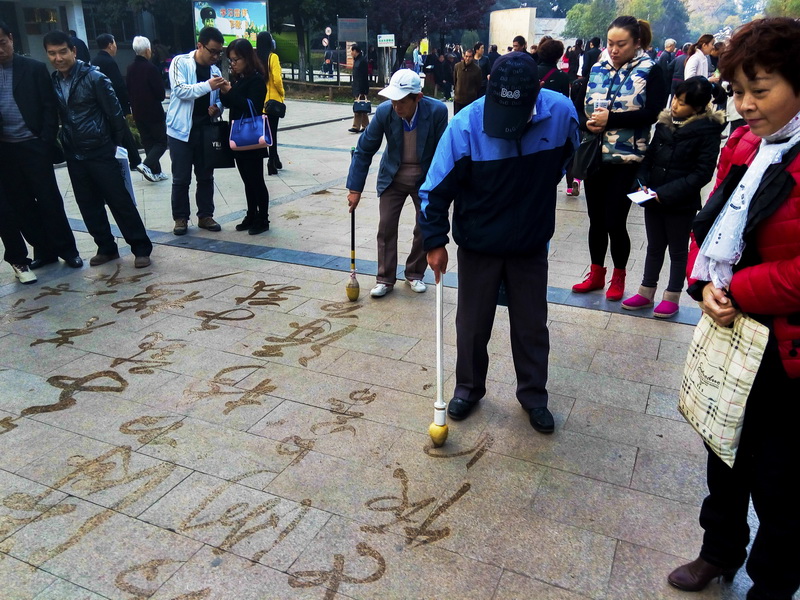 以地為紙、以水為墨,以自制海棉筆為主要書寫工具的書寫,這是目前在全國各地都比較流行的一種群眾文化活動。這種書寫方式,既怡情又健身,練了寫也涮了地;書者心情舒暢,圍觀者咋聲稱奇,常是公園或人眾休閑之地的一道風景線。