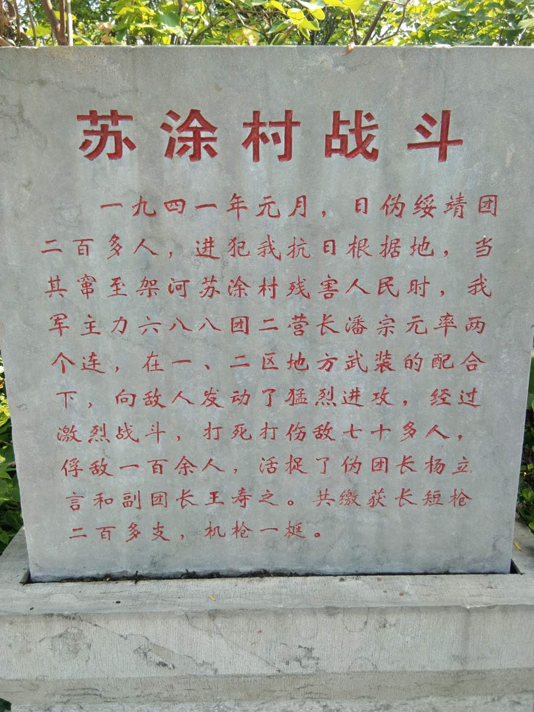 蘇涂莊上立奇功 1941年1月21日,接鳳臺縣委指示,日偽綏靖6團竄入田集東朱家溝沿過年,要求丁文山帶領二區隊星夜和一區區長王子云到謝街西北瓦溝沿集中待命,新四軍688團馮團長帶了一個營的兵力也先期到達,為統一指揮一區隊和二區隊合成一連,他們配合688團連夜急忙趕到朱家溝,但撲了空,敵團已向架河蘇涂莊逃竄,第二天凌晨六點在蘇涂莊和敵人遭遇,我方戰士英勇善戰,火力充足,敵人不堪一擊,這次戰斗打的十分漂亮,全殲敵人280余人,活捉日偽團長楊立言,副團長王壽之,繳獲槍支200多條和1挺機槍。