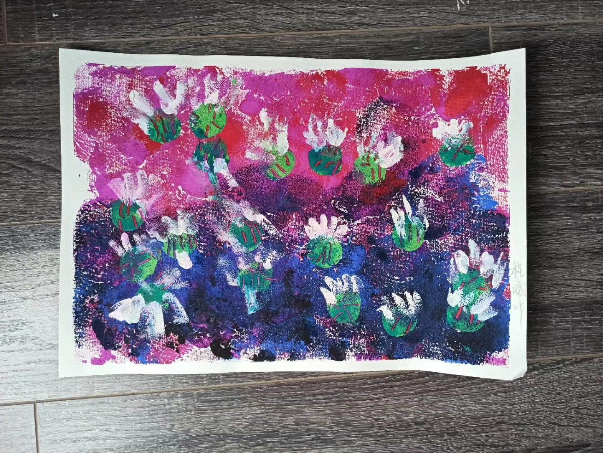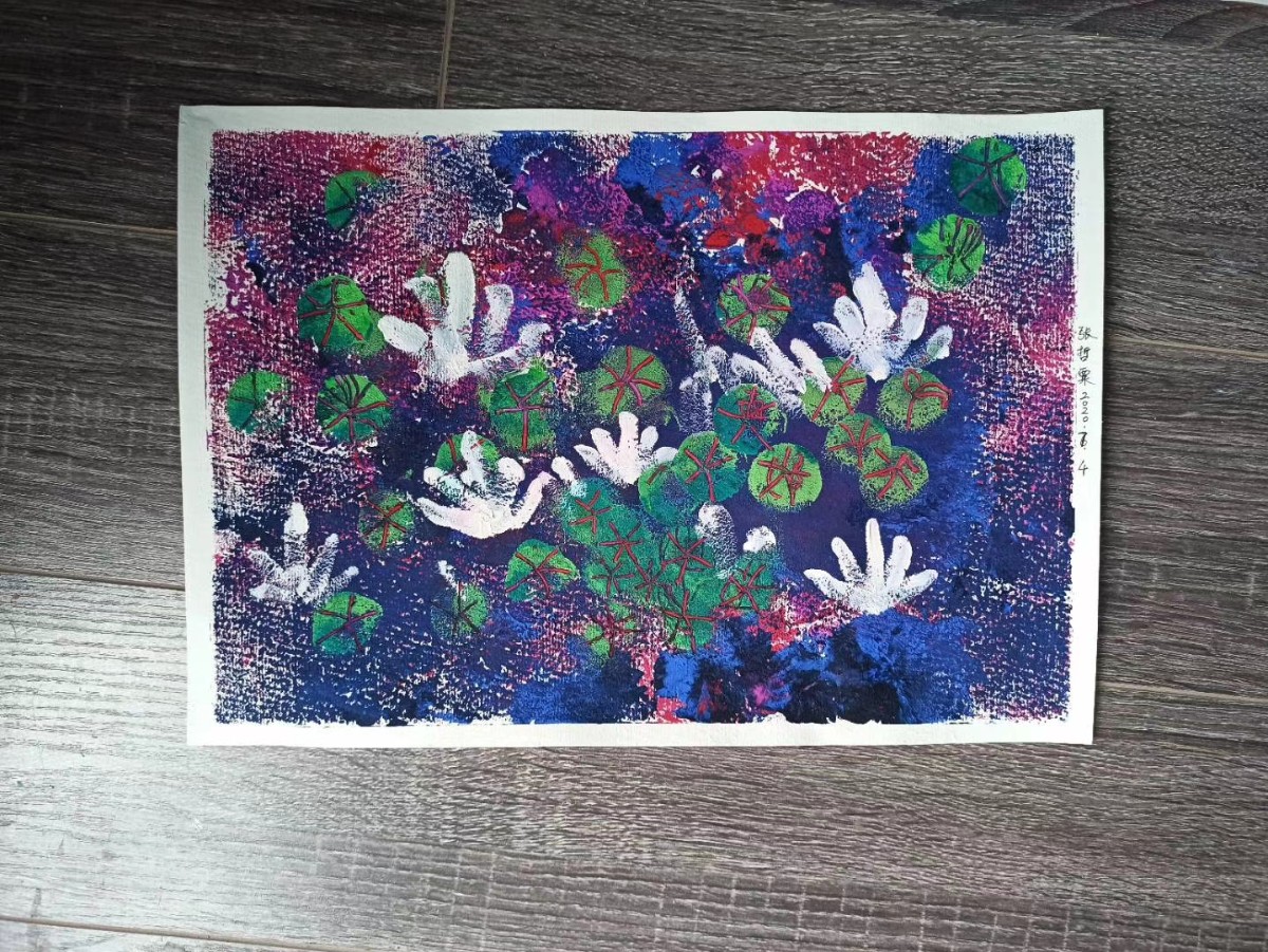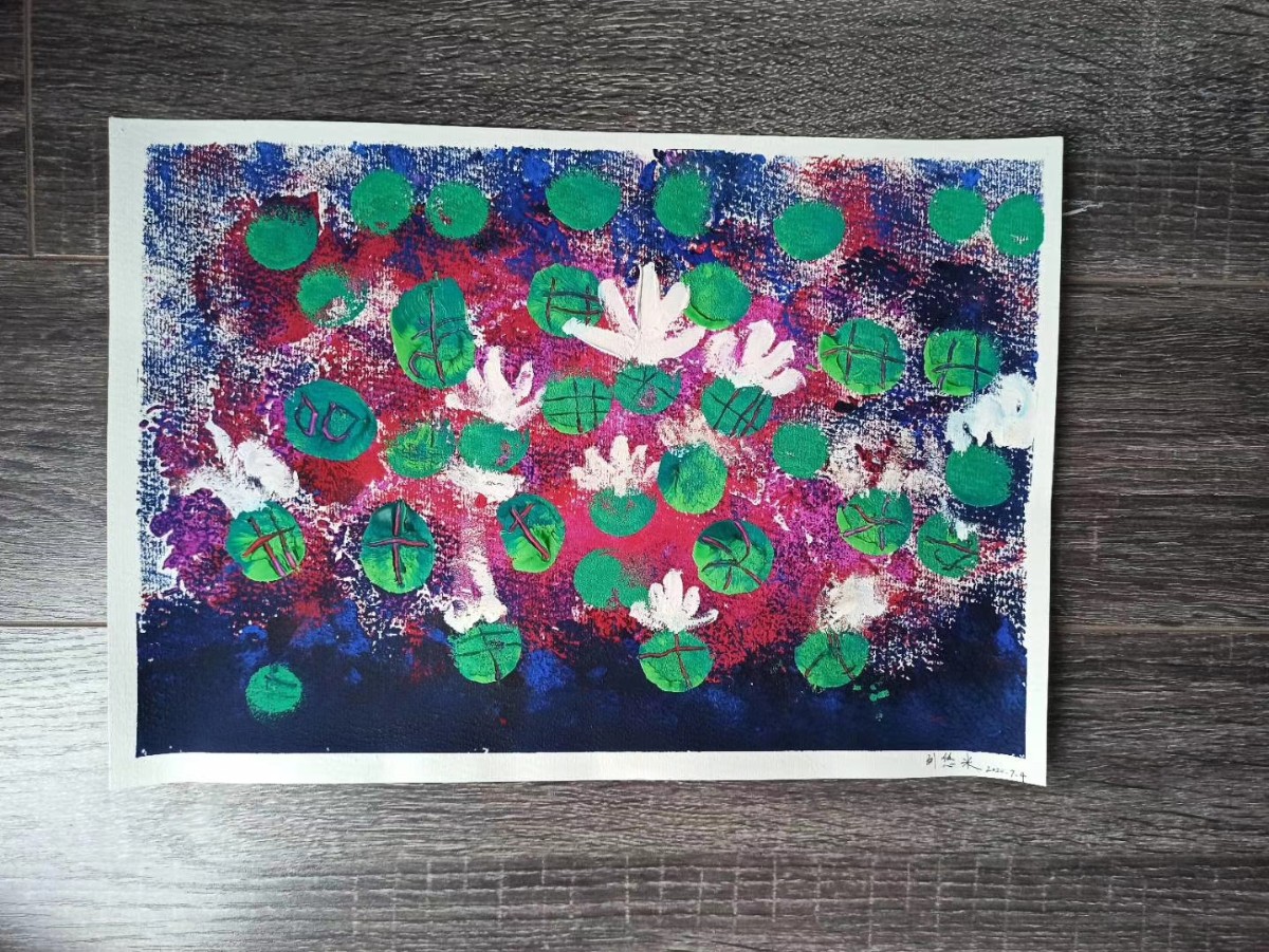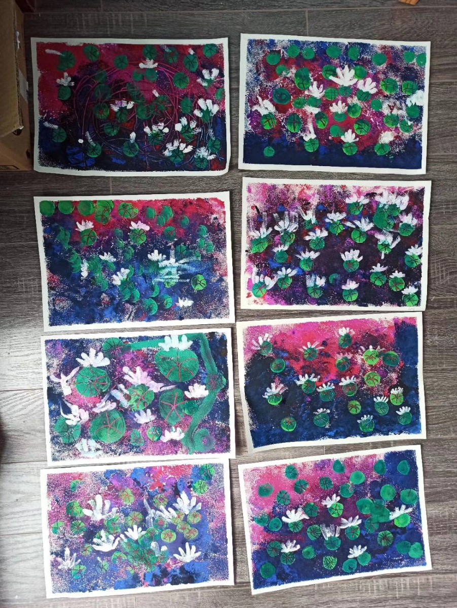 荔枝畫室:進入莫奈的睡蓮世界,老師先帶寶寶們玩一個色系,以后你們就可以玩很多色系。在玩中感受到了色彩搭配,有點大師的風采哦。