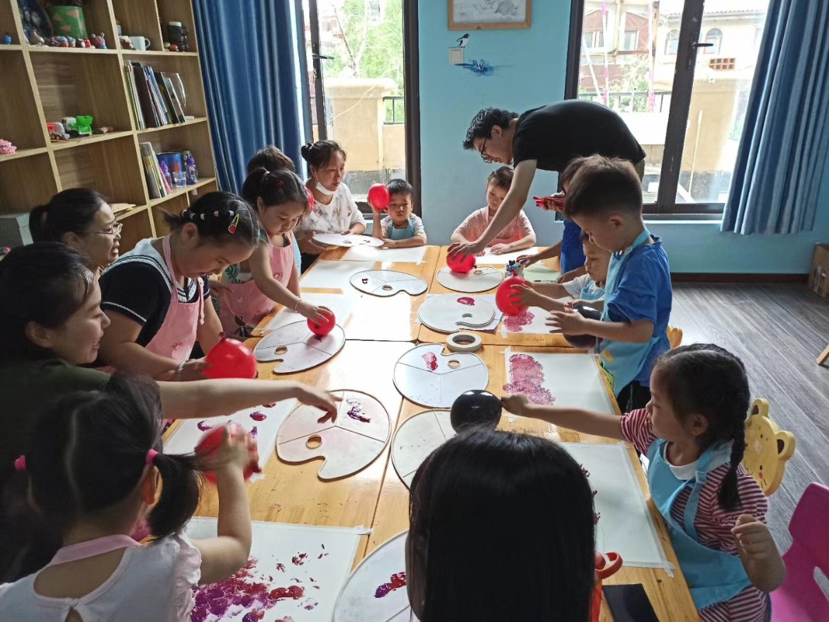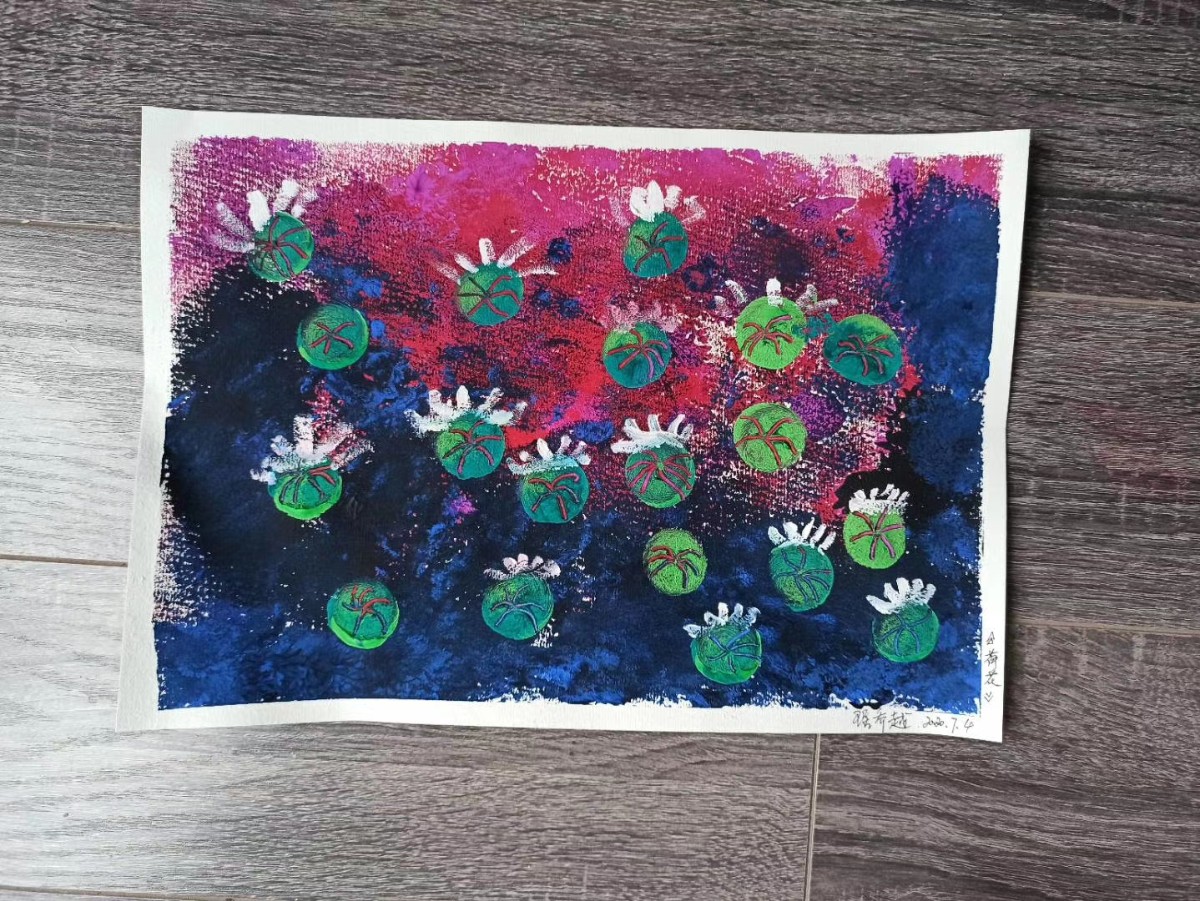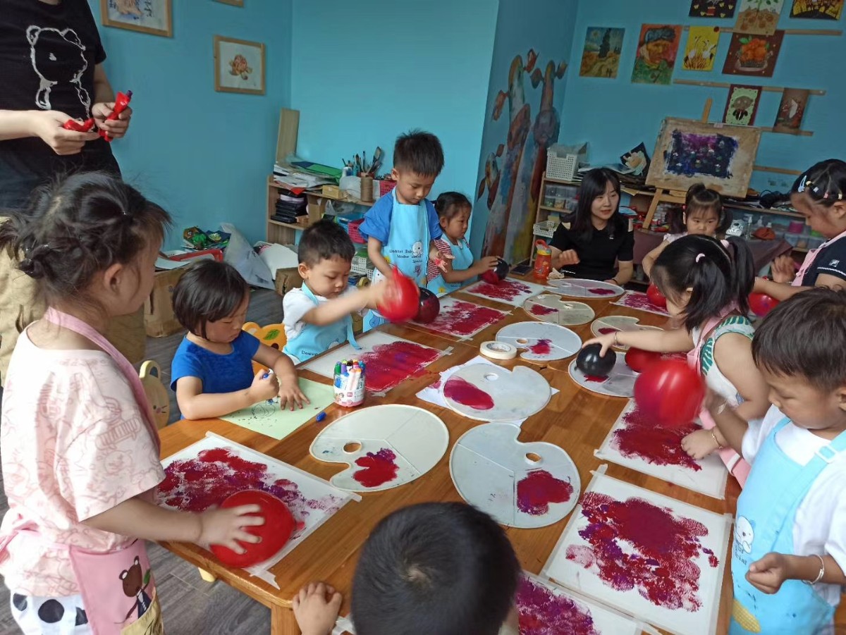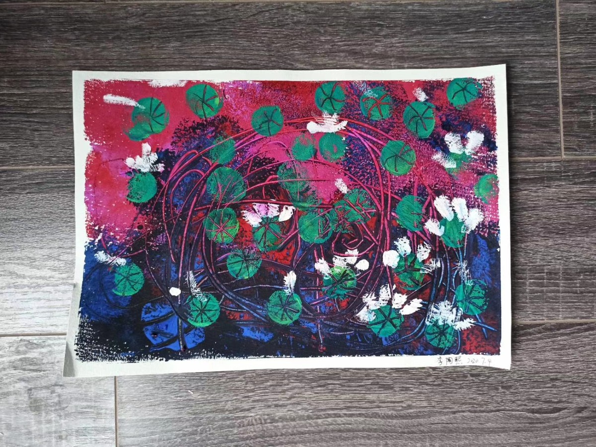 荔枝畫室:進入莫奈的睡蓮世界,老師先帶寶寶們玩一個色系,以后你們就可以玩很多色系。在玩中感受到了色彩搭配,有點大師的風采哦。