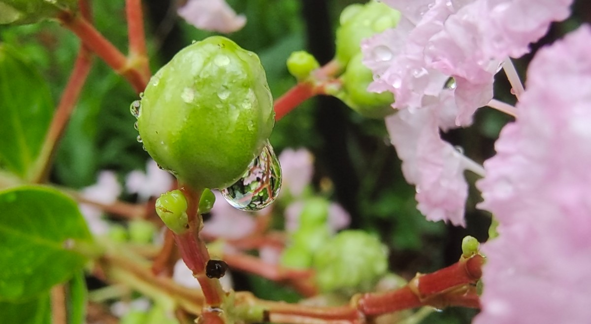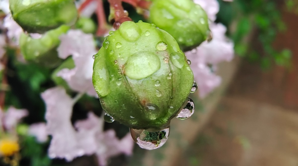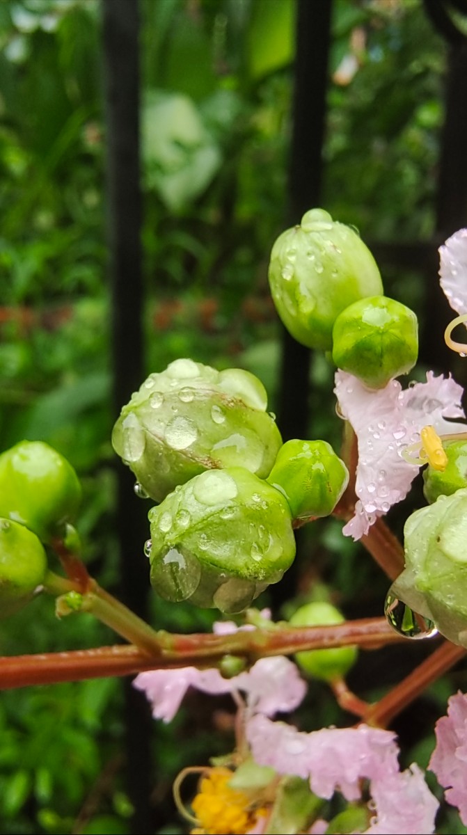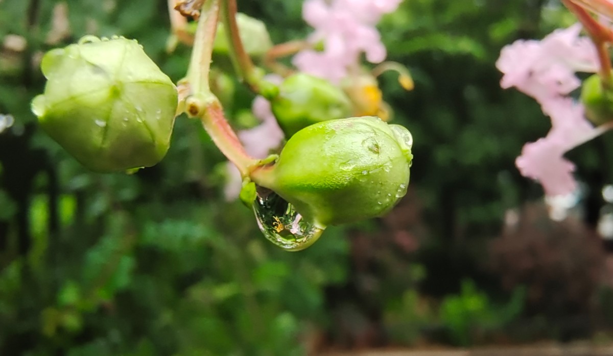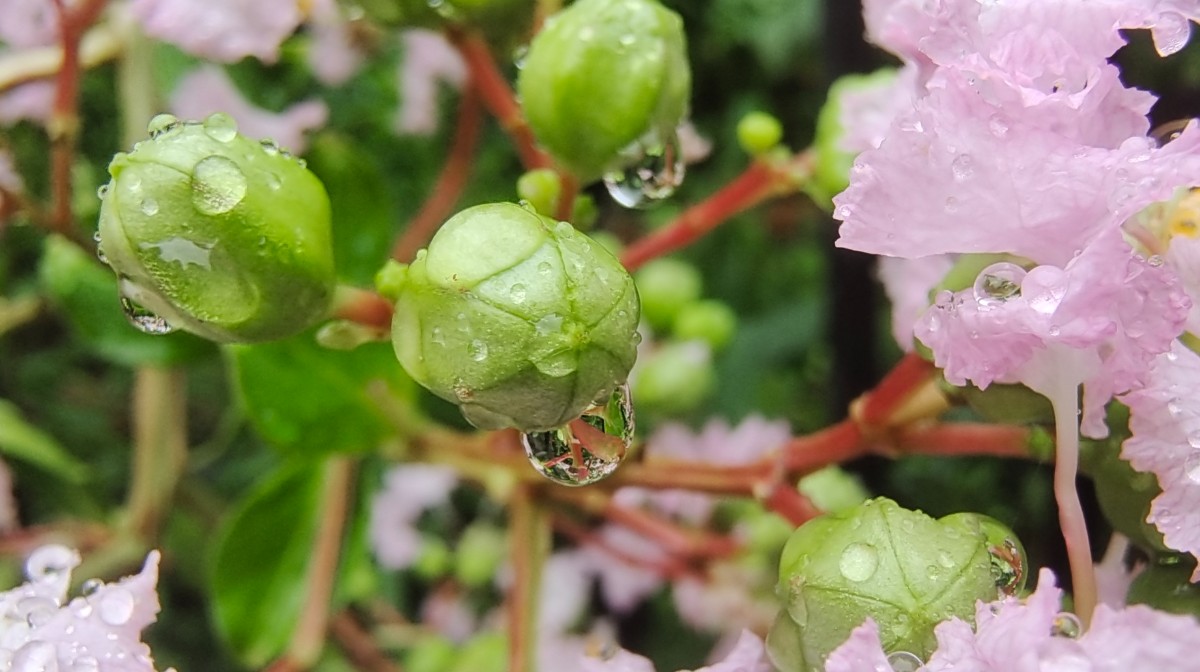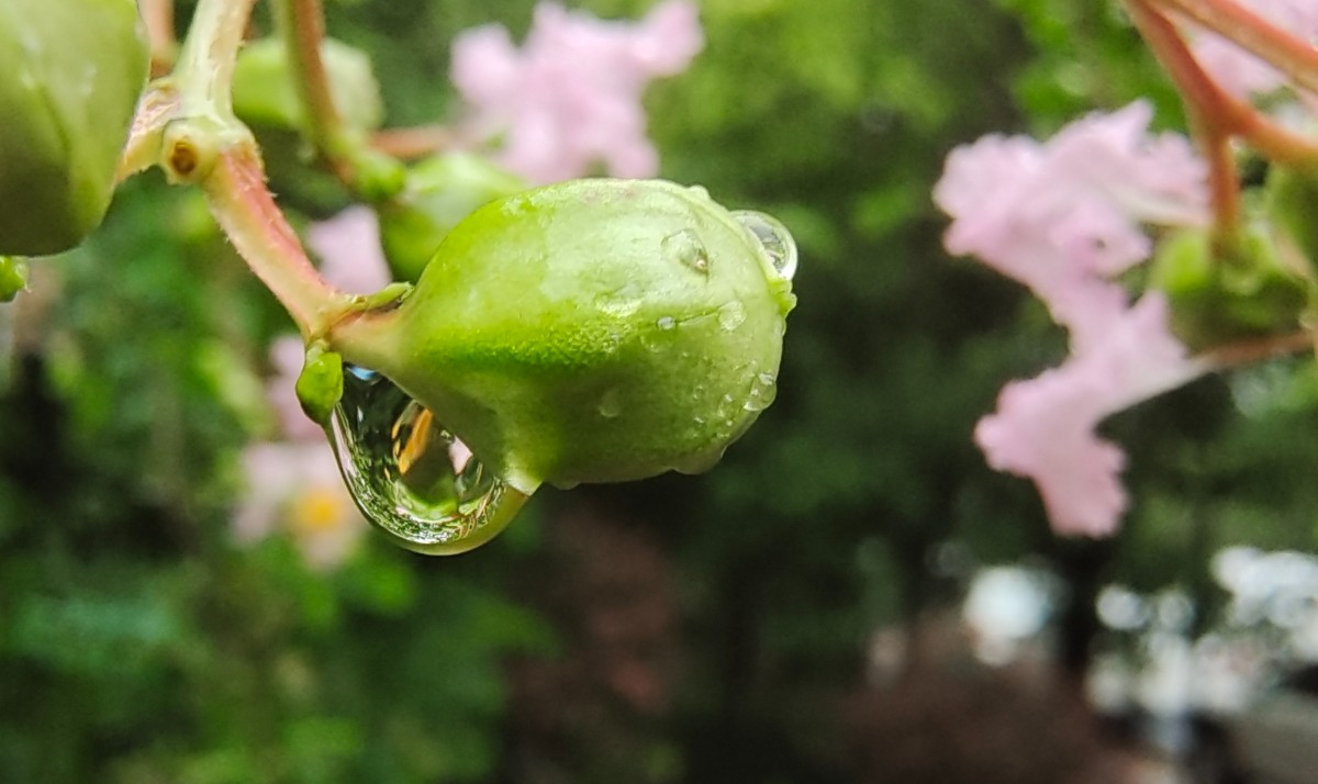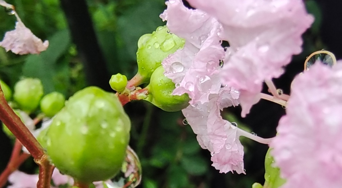 今晨出門沒下雨,晨練過程下起小雨,回來路上隨拍紫薇上水珠與大家分享,早安