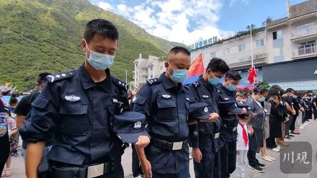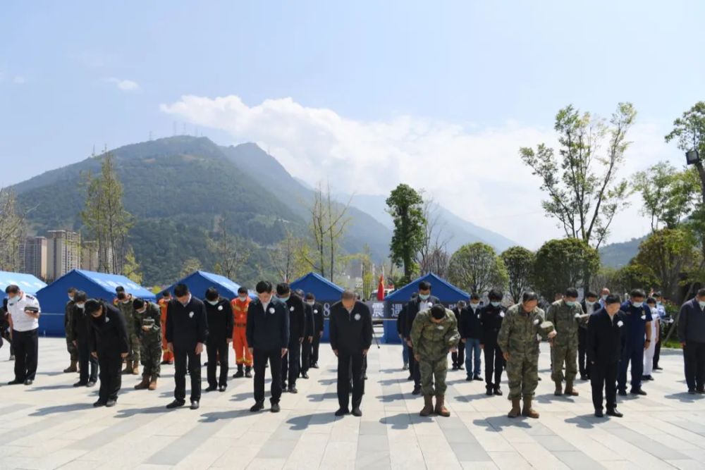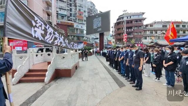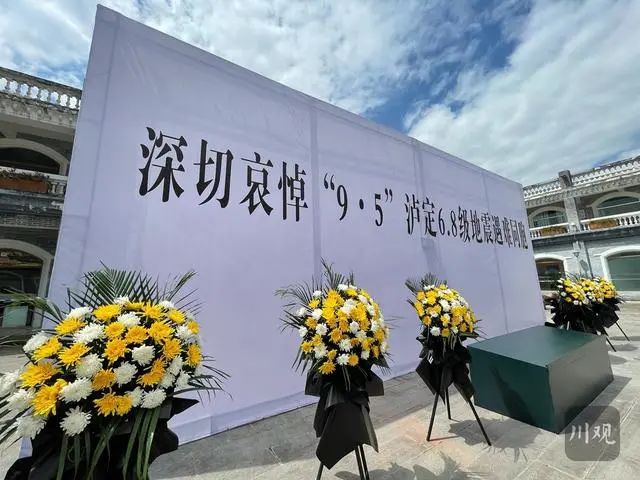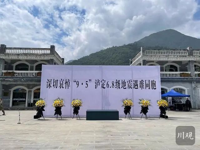 草木含悲,青山靜穆。位于震中磨西鎮的哀悼活動現場,懸掛著黑底白字的橫幅“深切哀悼‘9·5’瀘定6.8級地震遇難同胞”,莊重肅穆。12時50分,王曉暉、汪海江與在當地參與搶險救援的各界代表,胸前佩戴白花,神情凝重,默然肅立。12時52分,“9·5”瀘定6.8級地震發生的時間,防空警報鳴響在磨西鎮上空,大家在肅穆的氣氛中為地震遇難同胞默哀3分鐘。默哀畢,伴隨著深情的《思念曲》,王曉暉、汪海江相繼緩步上前,向地震遇難同胞敬獻鮮花,表達哀思。同一時間,石棉縣哀悼活動現場,黃強和各界代表一起默哀并敬獻鮮花。國務院抗震救災指揮部辦公室主任、中國地震局局長閔宜仁,西部戰區副司令員兼參謀長李中林,省委常委、省軍區政委田曉蔚,省委常委、秘書長陳煒,副省長田慶盈,武警四川總隊政委孟慶斌等依次敬獻,表達對遇難同胞的深切哀悼。