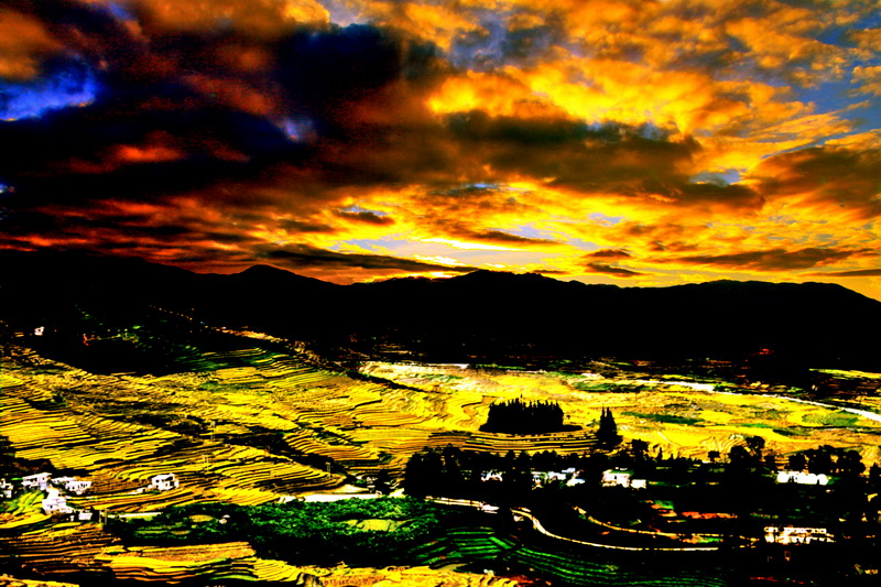 艷陽(yáng)金色染山鄉(xiāng),沃野流暉著麗妝。