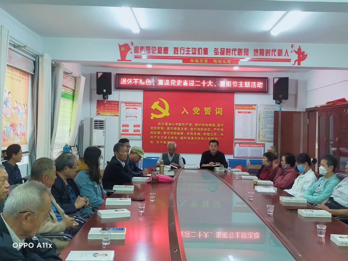 2022年10月4日上午,鳳臺縣城關鎮龍潭社區在三樓會議室,召集轄區內近四十名老黨員開展“退休不褪色 重溫黨史 喜迎黨的二十大 重陽節主題活動”。