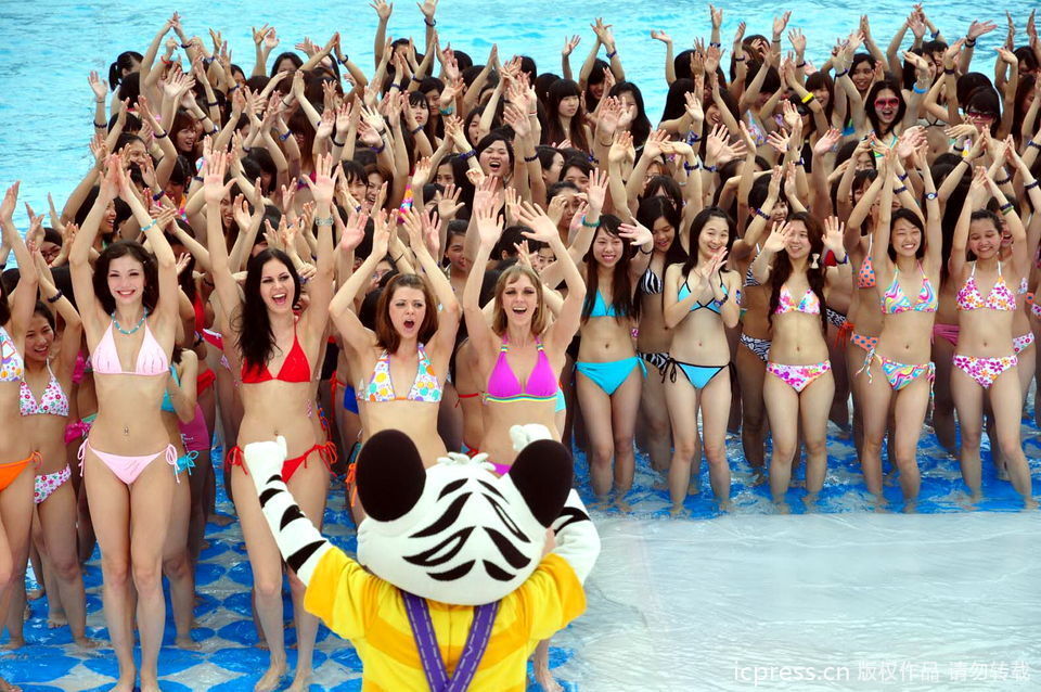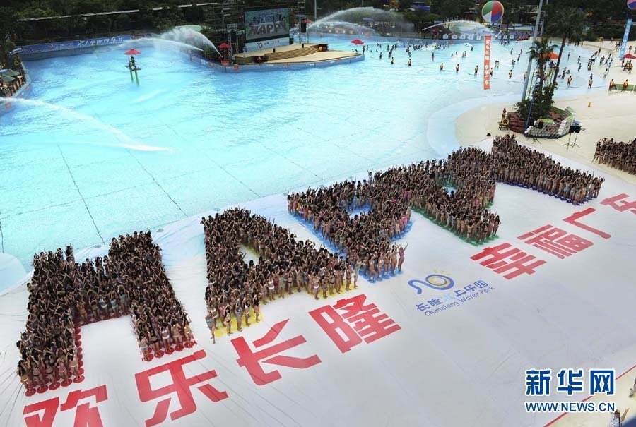 5月8日,參加廣州長(zhǎng)隆“萬(wàn)人比基尼”活動(dòng)的女孩們排出“HAPPY”字型。當(dāng)日,第四屆“萬(wàn)人比基尼”活動(dòng)在廣州長(zhǎng)隆水上樂園舉行,參加活動(dòng)的女孩們身穿比基尼,排出碩大的英文“HAPPY”(歡樂)字形。